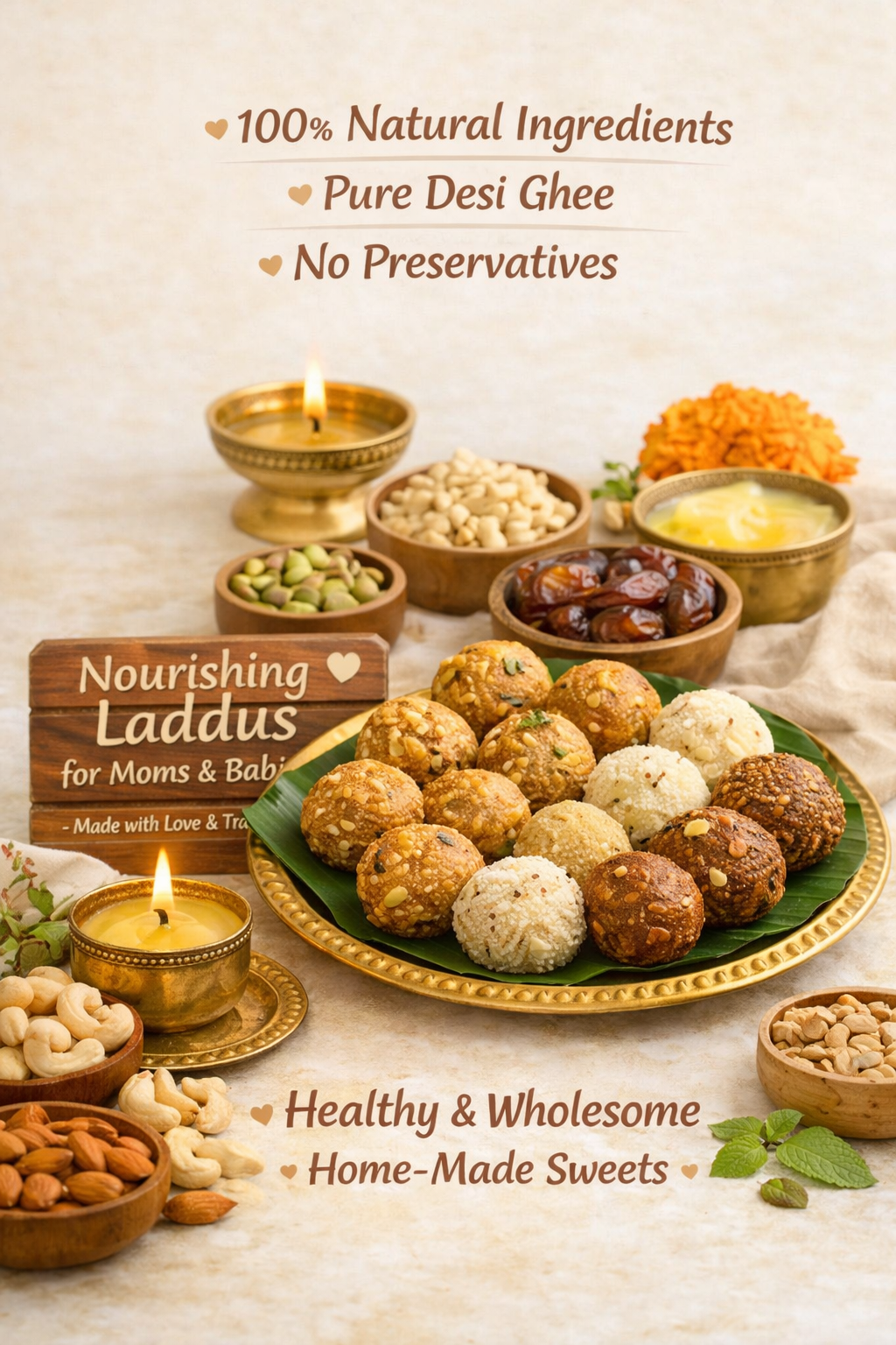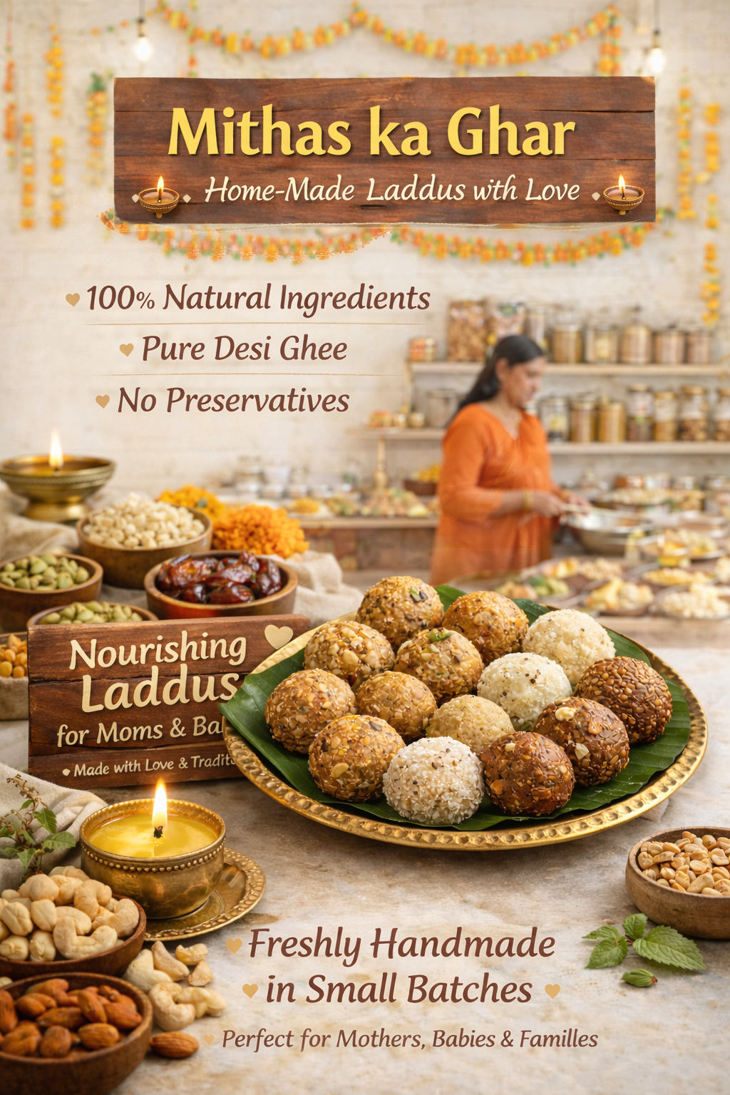 Every laddu in our kitchen is prepared with care, tradition, and natural ingredients. Our special focus is on the health and nutrition of pregnant women and their baby in womb, ensuring each bite is gentle, wholesome, and nourishing. We follow trusted traditional recipes that support strength, recovery, and overall well-being.